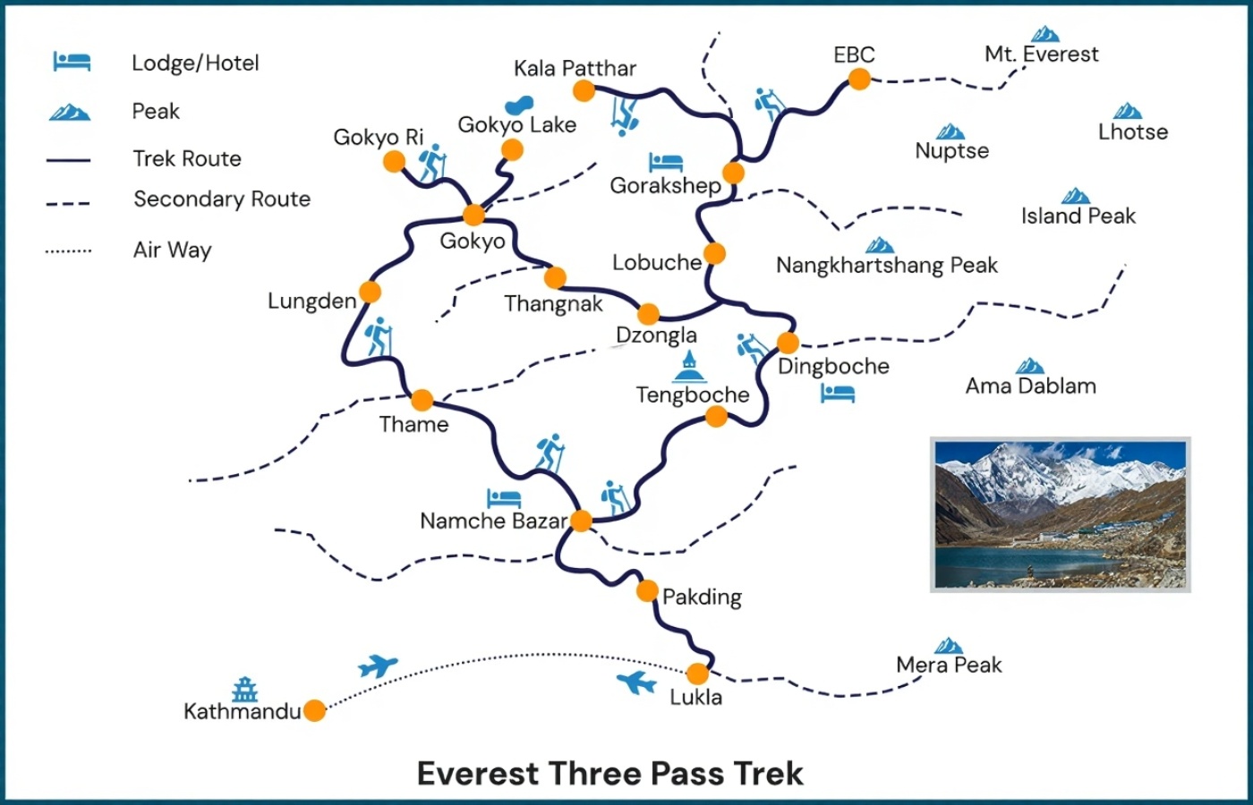 - Breathtaking views of Himalayan giants: Everest, Lhotse, Nuptse, Ama Dablam, Makalu, Cho Oyu, and more