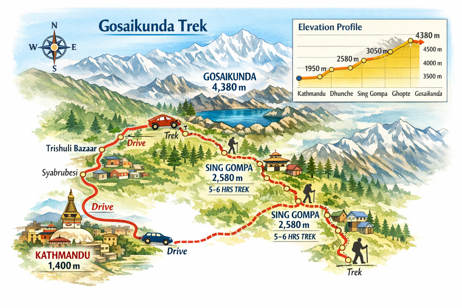 - Visit the sacred alpine lake of Gosaikunda (4,380m), a holy pilgrimage site for both Hindus and Buddhists.